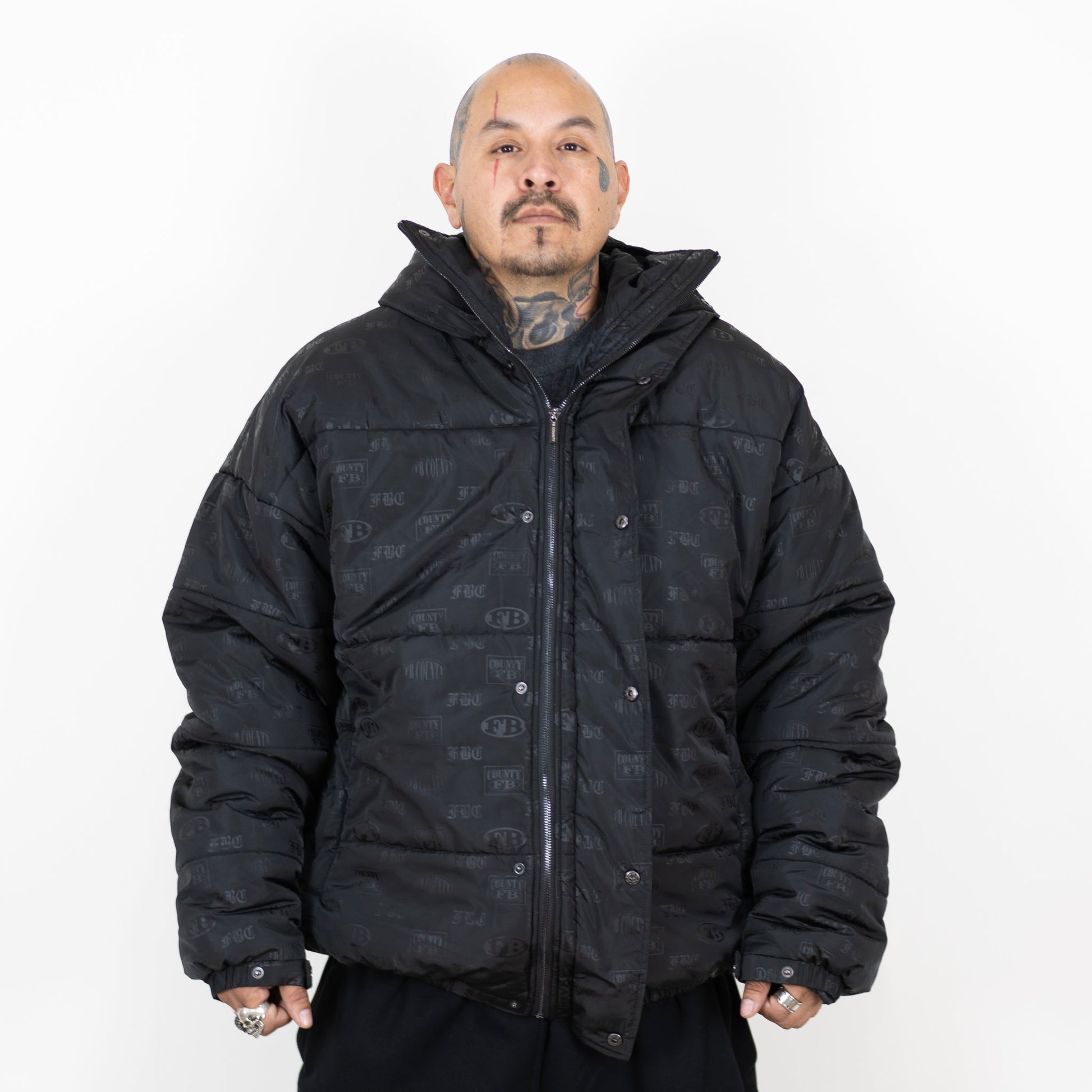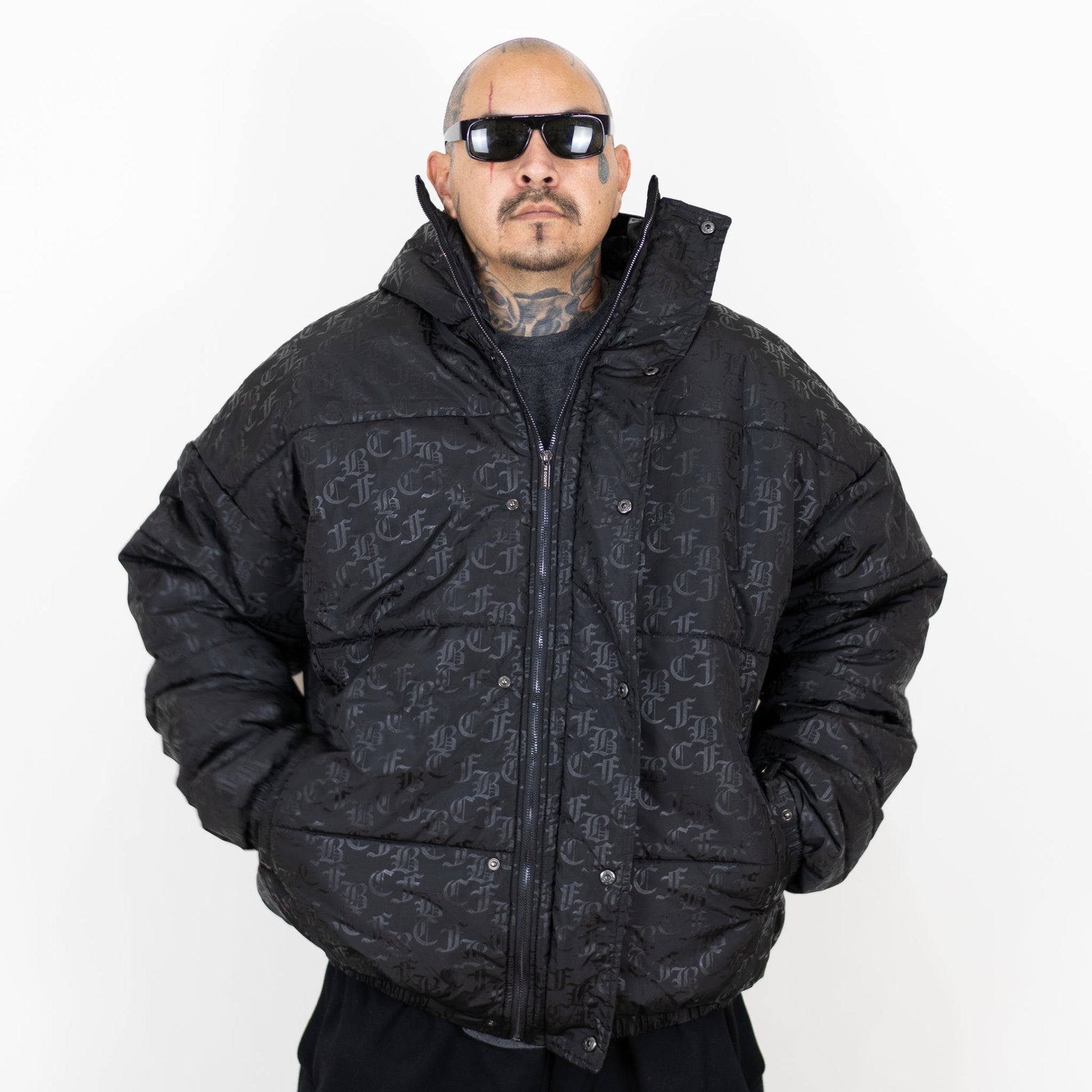 Introducing our New Limited Edition FB County Puffer Jacket with old english letter printed FBC initials. A truly one-of-a-kind puffer jacket showcasing a classic and vintage FB County look with an all-over old english printed design. This jacket is like no other. The fabric is super thick and warm.